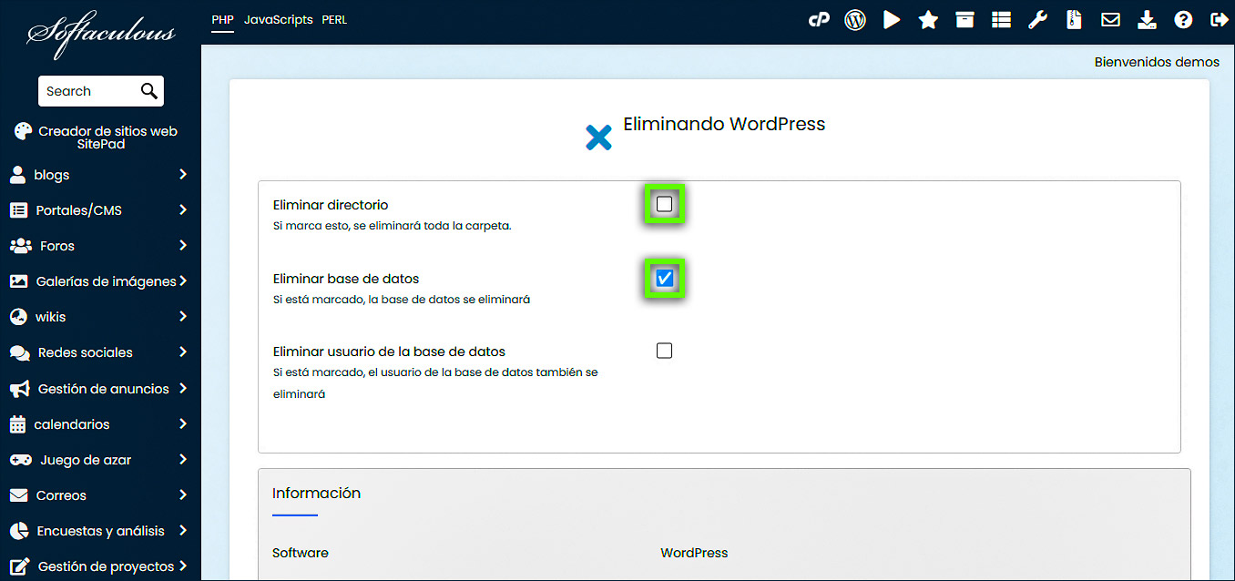 Este artículo explica cómo eliminar una instalación de script con Softaculous. Usaremos WordPress como ejemplo. Recomendamos crear una copia de seguridad de su sitio web de WordPress antes de continuar con esta acción.
