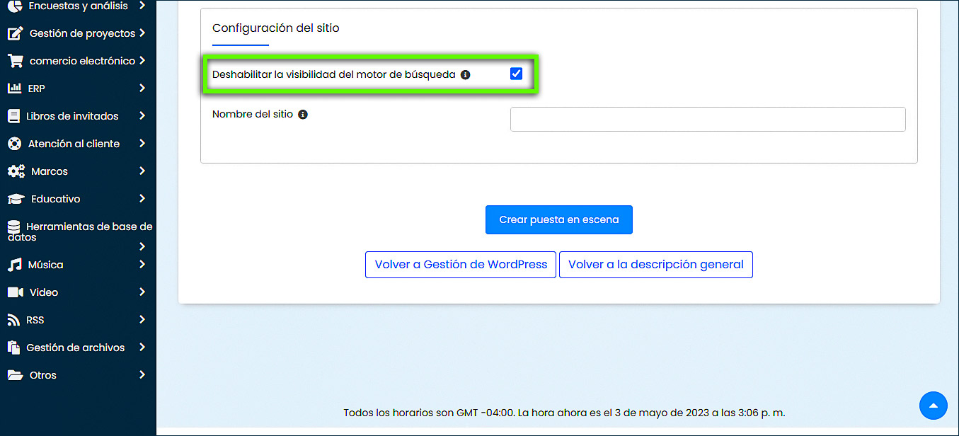 6. Marque la casilla Deshabilitar la visibilidad del motor de búsqueda si no desea que su sitio de ensayo se muestre en los resultados del motor de búsqueda.