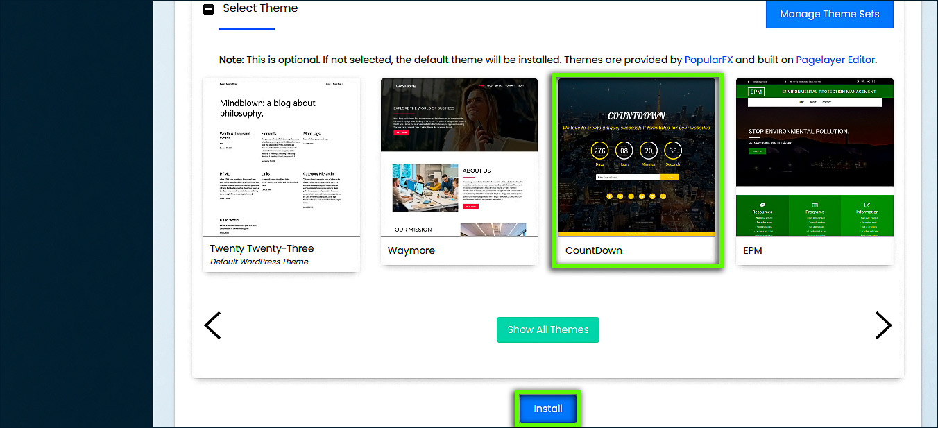 Establezca la configuración de usuario de Softaculous para el idioma, la zona horaria, clasifique los dominios alfabéticamente, personalice el tema y los complementos / conjuntos de temas de WordPress. |